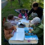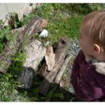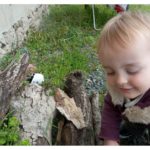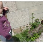 Lucie et son nouveau pote le lézard vert ; elle n’a pas réussi à le caresser quand même, mais n’en était pas loin !